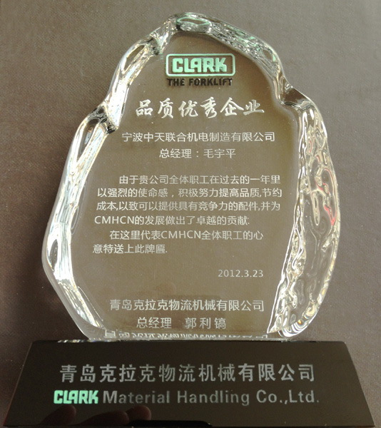在本月召開的青島克拉克物流機械有限公司供應商會議中,中天公司在30多家供應商中憑借優(yōu)秀的質量、成本及交貨率被評為品質優(yōu)秀企業(yè)。此次會議共設兩名優(yōu)秀供應商,中天公司為獲得此殊榮的兩家企業(yè)之一。