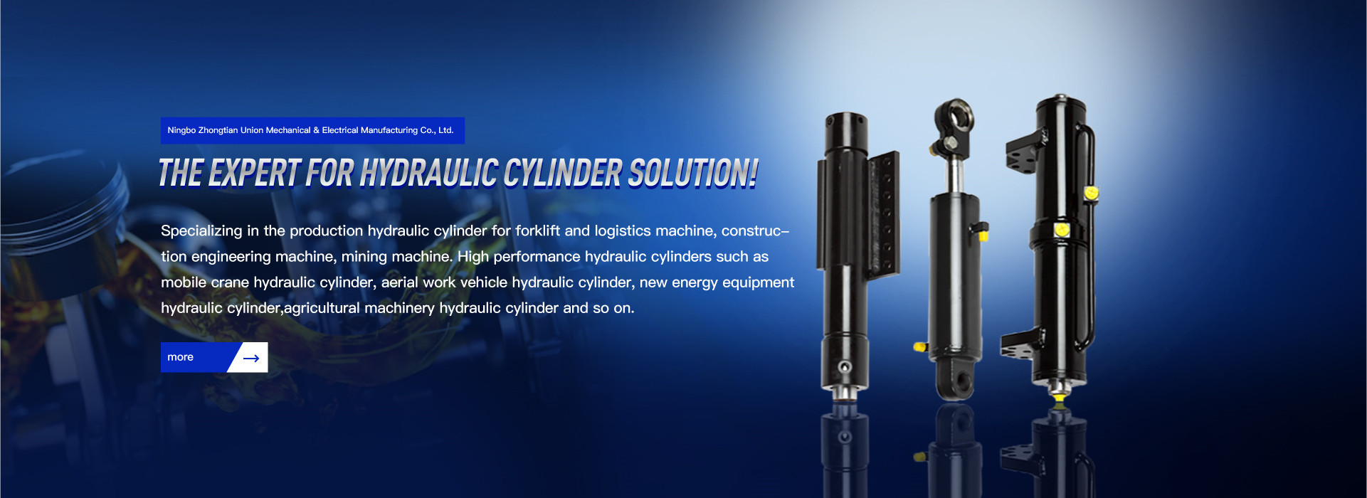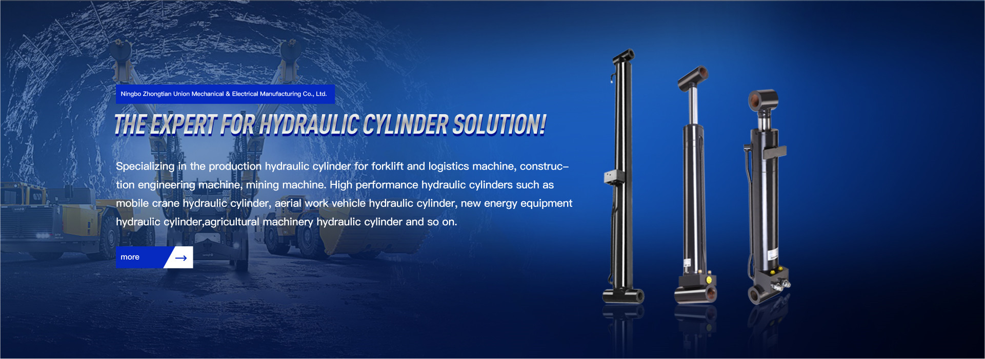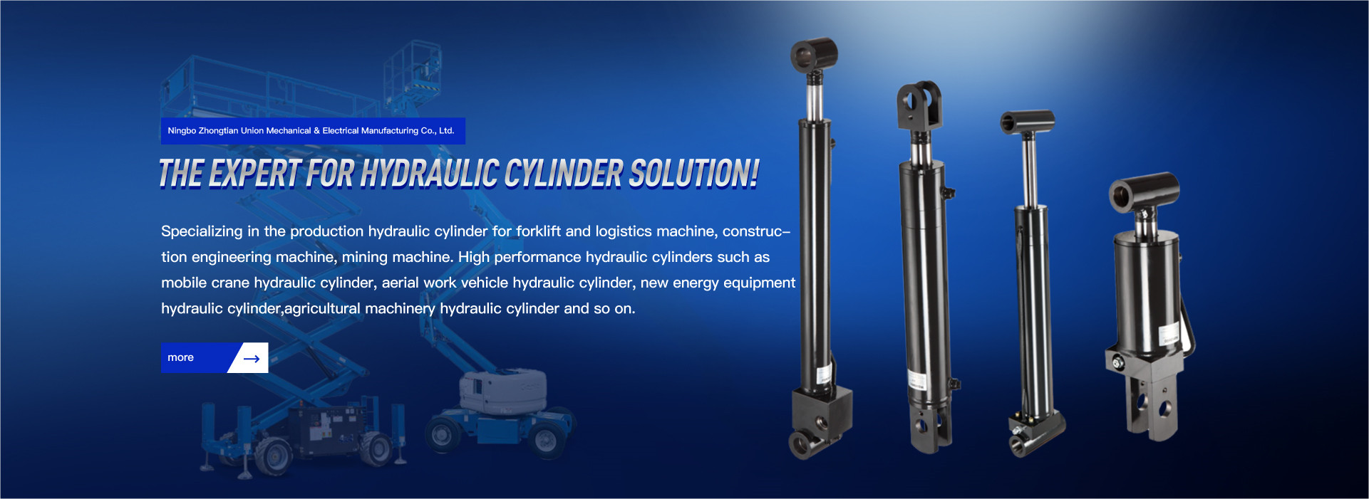 Ningbo Zhongtian is an enterprise specializing in the production, design and sales of high-performance hydraulic cylinders. Its products are widely used in forklifts and logistics machinery, construction machinery, mining machinery, mobile cranes, aerial work vehicles, new energy equipment, agricultural machinery and so on . It is located in Yinjiang Town, Haishu District, Ningbo City, on the bank of the world's eastern port. It has convenient transportation including seaport, international airport and expressway.